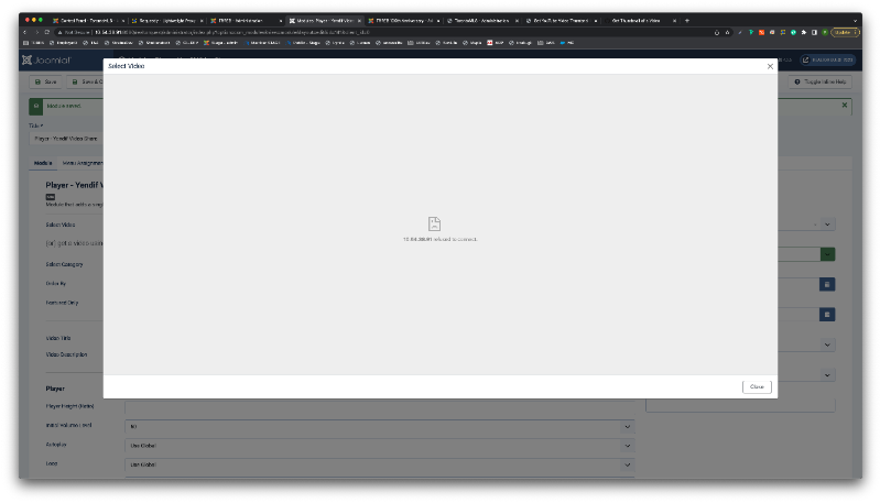 However when I try to e.g. change user in the Video tab, or choose a video in the Player module or preview a video in the front I'm constantly getting "refused to connect" error messages. Please see attached screenshots. I've tried to modify the iFrame URL to make sure the path is correct but to no avail.